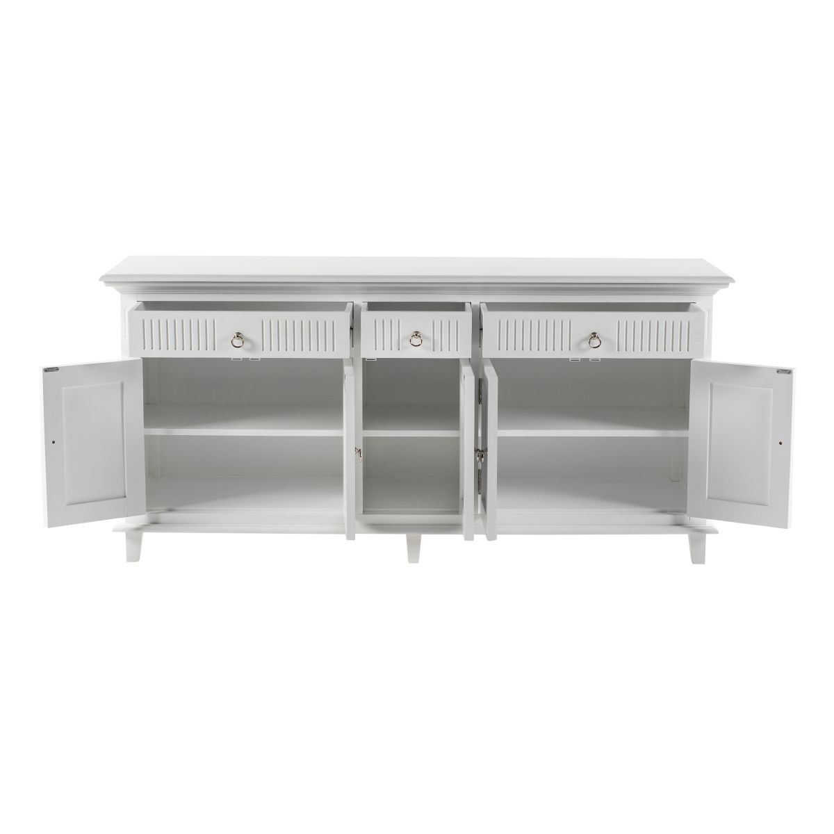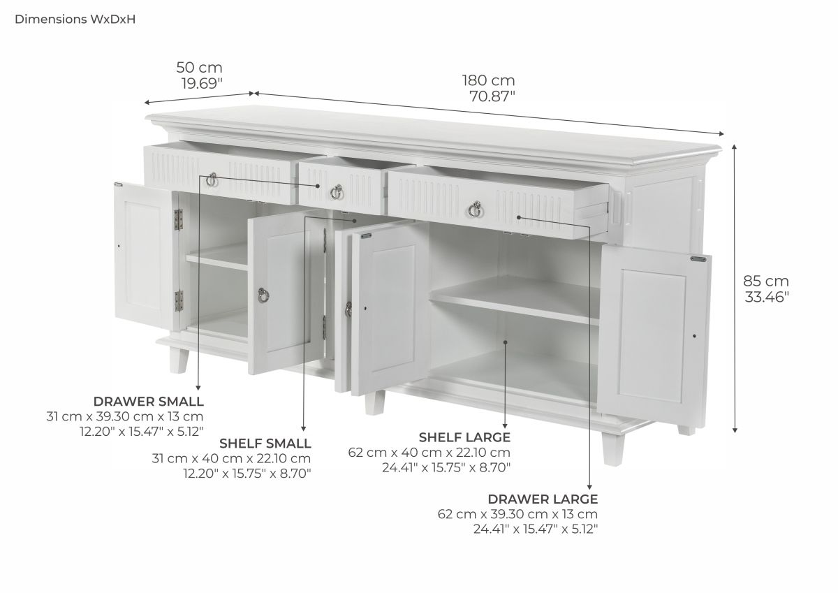 Diese Anrichte ist mit 5 Türen und 3 Schubladen ausgestattet und hat je einen Einlegeboden aus Holz hinter den Türen.