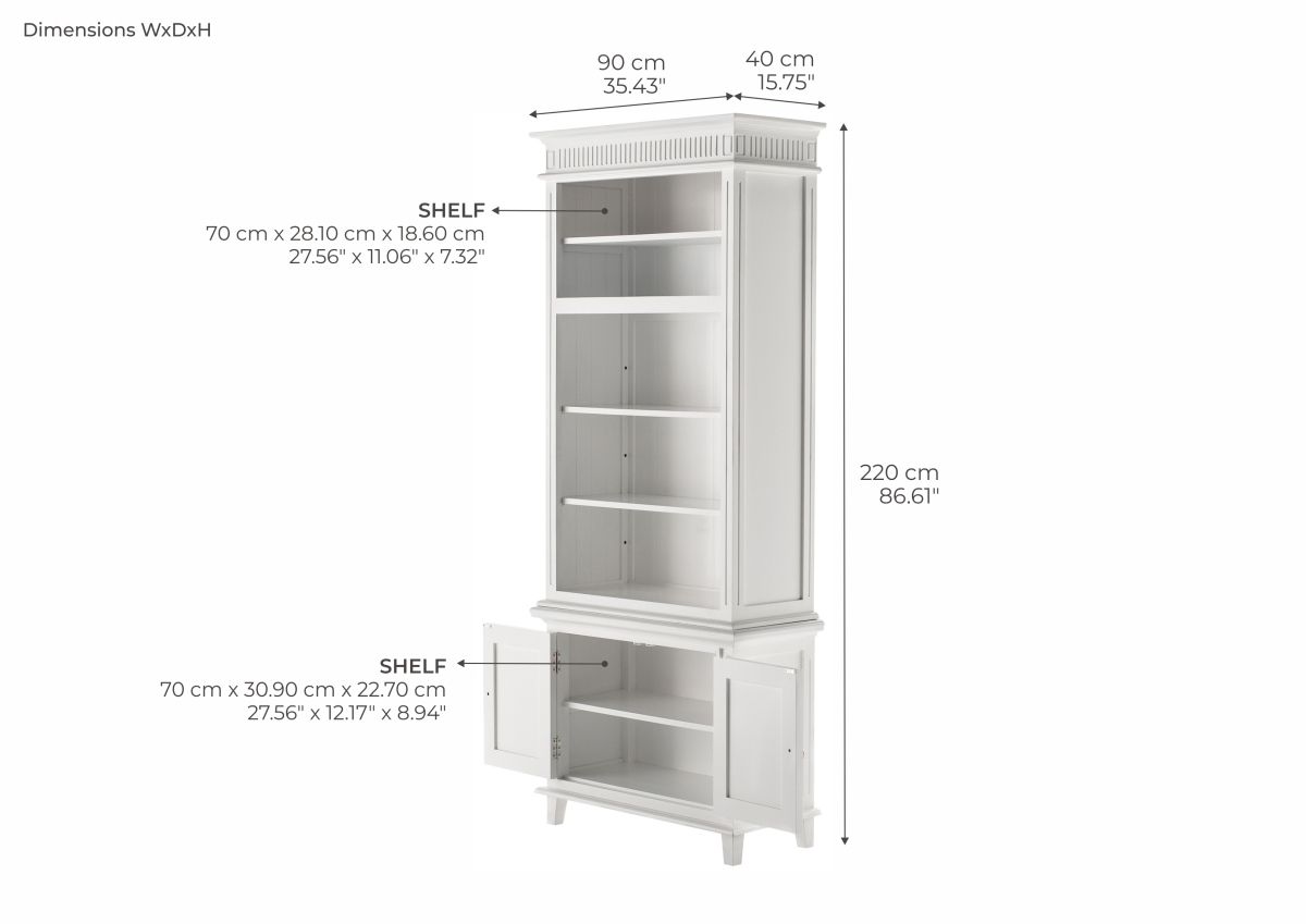 Der sehr dekorative Bücherschrank ist seidenmatt in weiß lackiert.