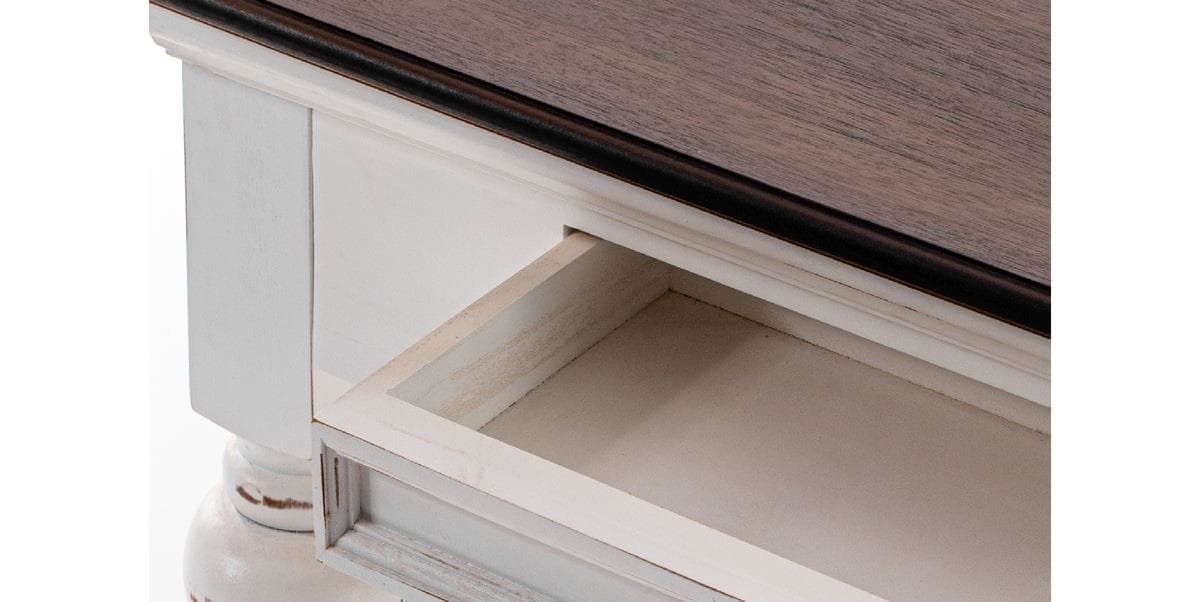 Die braune Topplatte aus MDF ist mit echtem Holzfurnier ausgestattet und zeigt die Maserung des schönen echten Holzes unter der durchscheinenden Lackierung. Der weisse Korpus und die Rahmen der Schubladen und Fronten wurden einzeln und von Hand nachträglich mit Gebrauchsspuren versehen. So entsteht der unverwechselbare Shabby Charme eines scheinbar gebrauchten Möbelstücks.