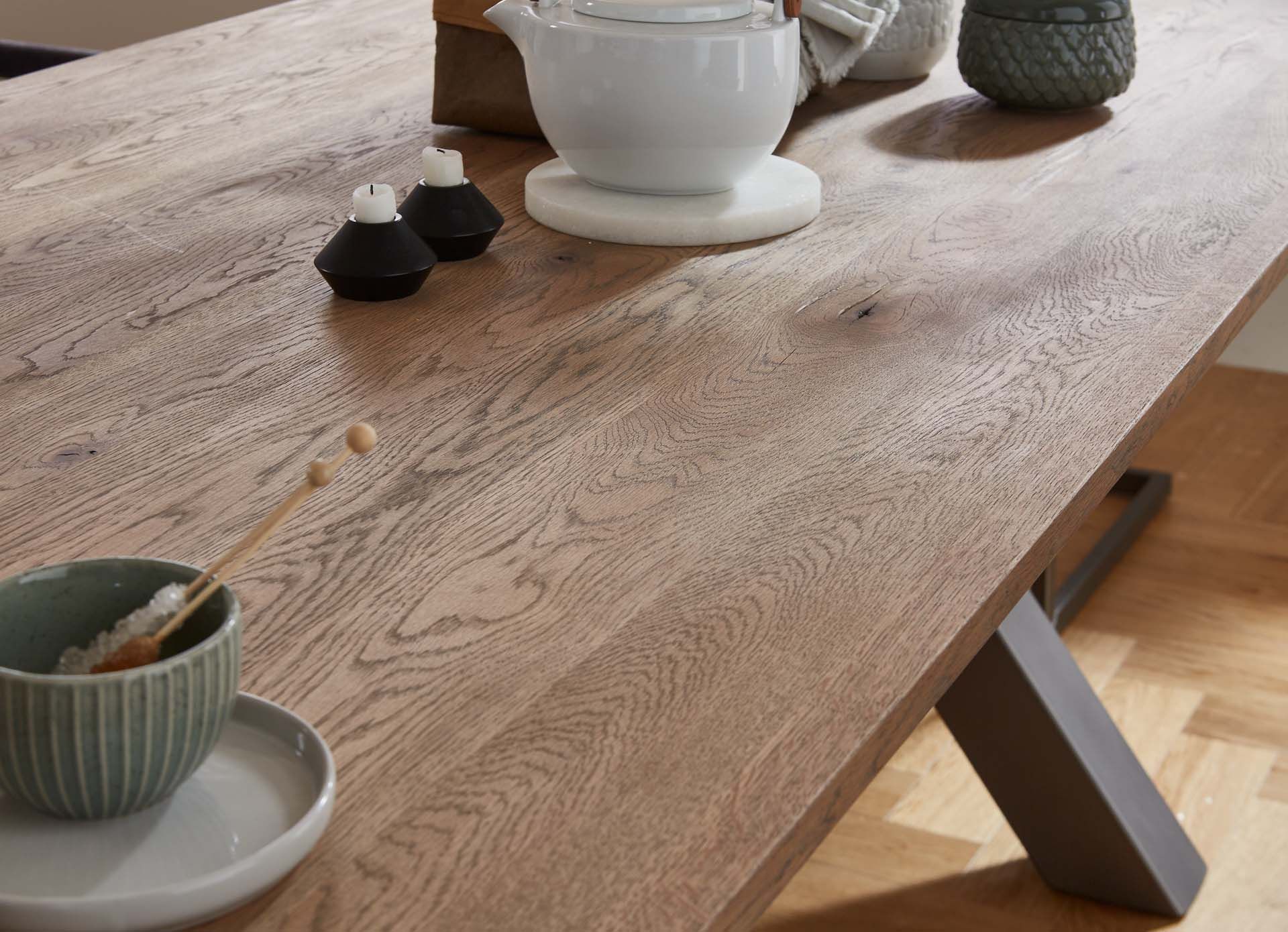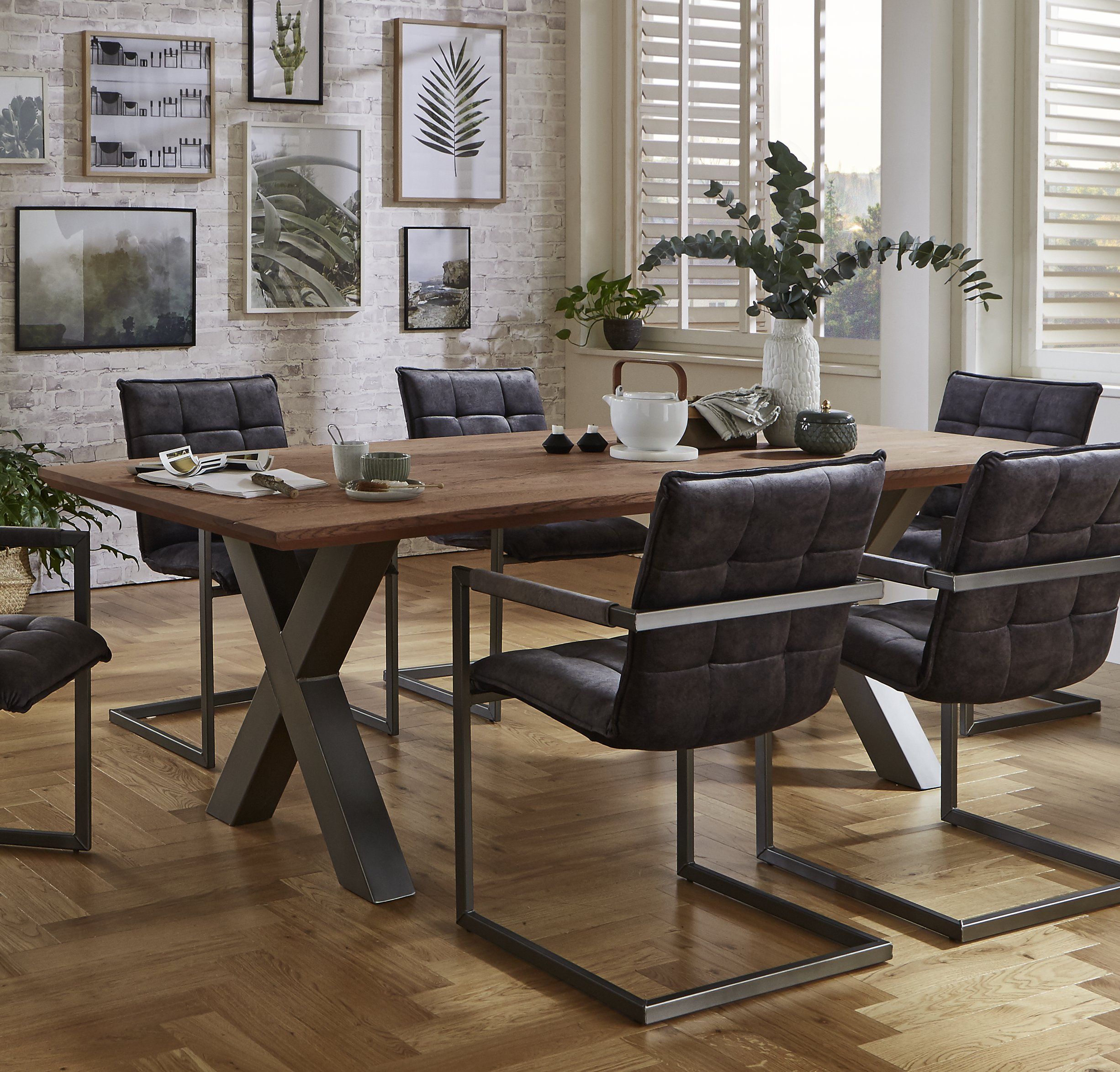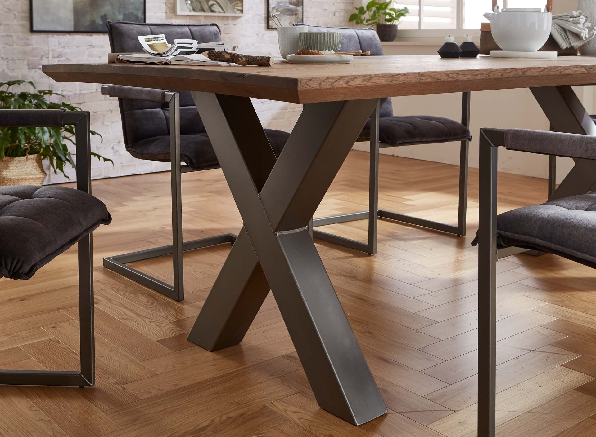 Das moderne X-Gestell aus Stahl verleiht dem Tisch einen Hauch von Industrial-Charme und ist wahlweise in Schwarz oder Natur erhältlich. Damit entsteht ein spannender Kontrast zum natürlichen Holz – für eine stimmige Mischung aus Rustikalität und modernem Design.