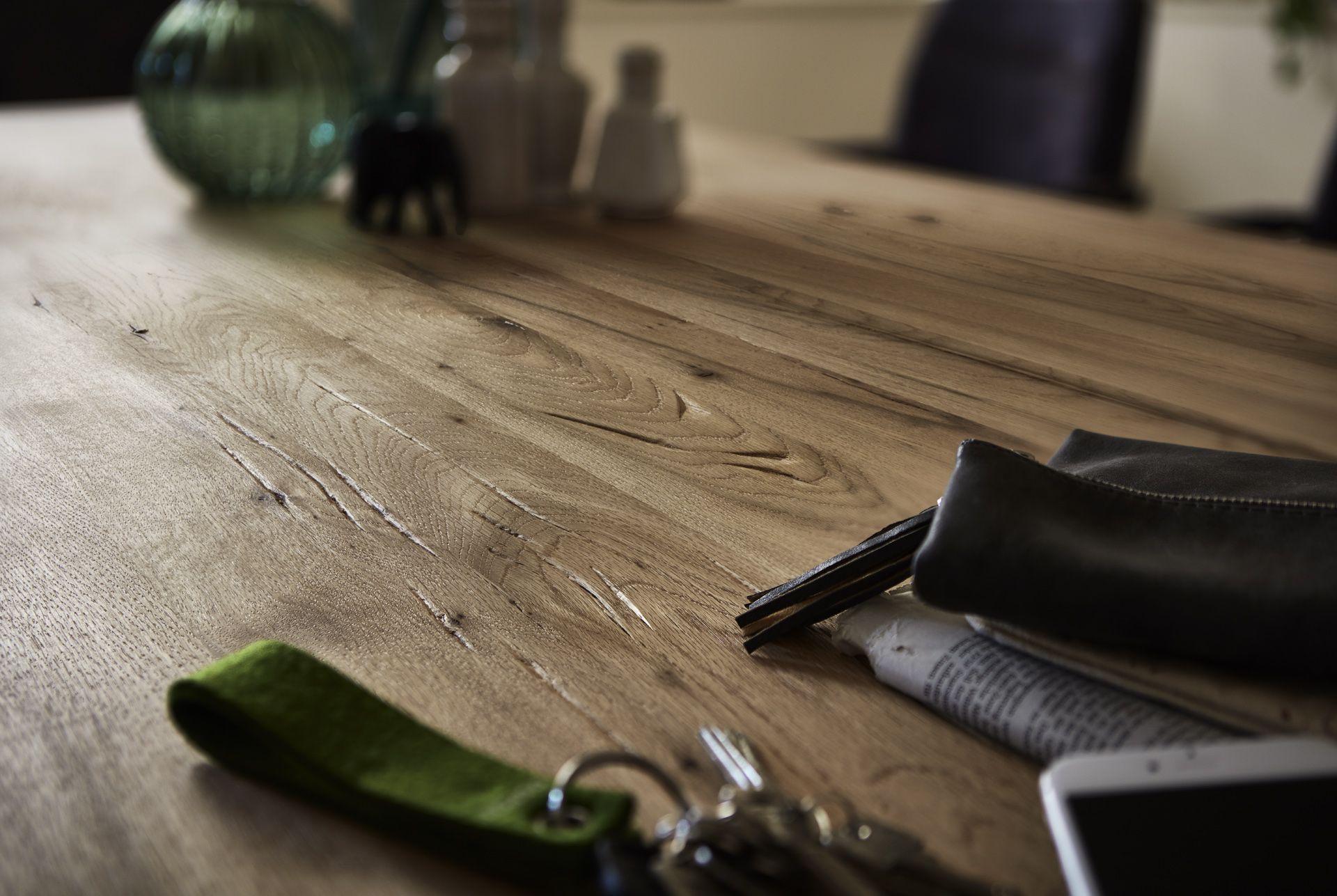 Mit dem Palmira Esstisch holen Sie sich ein Möbelstück ins Haus, das Individualität und Qualität verkörpert. Die Tischplatte wird aus wahlweise massiver Zerreiche oder massiver Wildeiche gefertigt – beides hochwertige Eichenarten, die sich durch ihre natürliche Maserung und Farbstruktur auszeichnen. Die am Rand auf ca. 4 cm verstärkte Platte sorgt für Stabilität und eine kraftvolle Ausstrahlung.