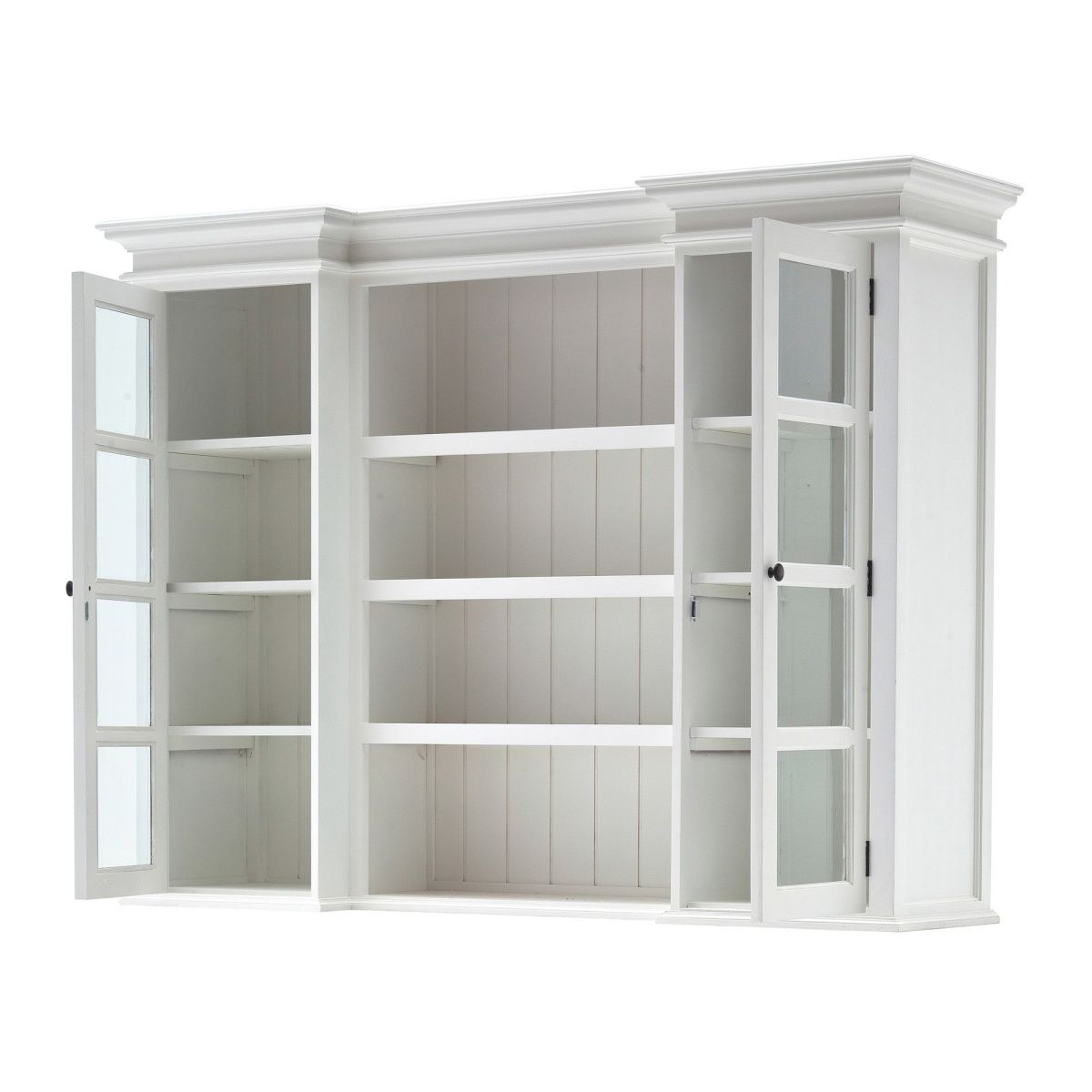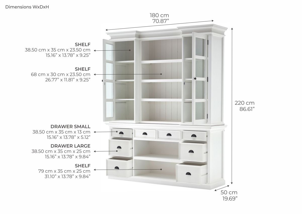 Der Aufsatzschrank Halifax - hat Mahagoni Rahmen, ist antikweiss lackiert mit von Hand hervorgearbeiteten Gebrauchsspuren - Vintage-Look. Die Rattankörbe sind in Kubu grau und werden natürlich mit geliefert. Die Schubladenkommode unten ist mit leichtgängigen Auszügen ausgestattet. Wir liefern dieses schöne weiße Landhausstil Möbel in 2 Elementen fertig montiert. Die Maße betragen Maße: Breite: 180 cm, Tiefe: 50 cm, Höhe: 220 cm. Der Aufsatz ist mit 2 verglasten Türen und in der Mitte mit offenen Fächern ausgestattet. Alle Böden sind fest und in der Höhe nicht verstellbar. Das Unterteil des Aufsatzbuffets ist mit 4 großen Schubladen, 4 kleinen Schubladen und vier Fächern mit Rattankörben gearbeitet. Natürlich wird auch diese Aufsatzvitrine in der bekannt guten Qualität des gesamten Halifax Landhaus Möbel Programms hergestellt. Denn hier bieten wir das Original an und keine billig nachgemachte Kopie!