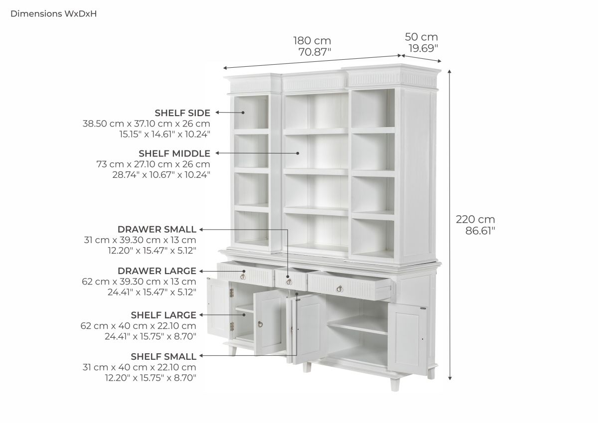 Maße: Breite: 180 cm, Tiefe: 50 cm, Höhe: 220 cm.