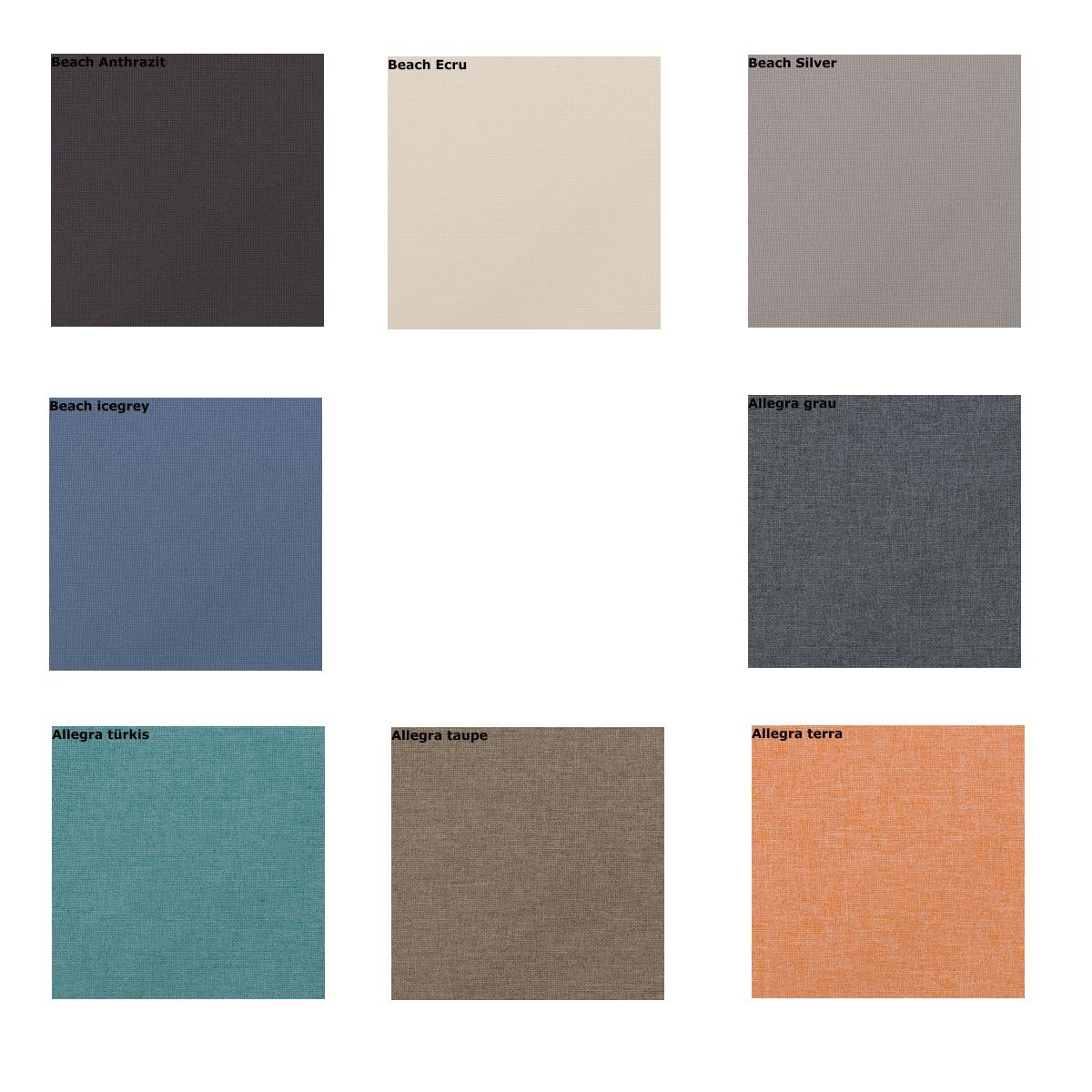 Material: Gestell: Wasserfeste und witterungsbeständige Holz Siebdruckplatten im FSC® -Mix Bezug: Allegra Öko Tex - 100: 90% Polyester, 10% Polyethylen in vier Farben wasserabweisend oder Bezug: Beach Öko Tex - 100: 88% Polyester, 12% Polyethylen in vier Farben wasserdicht laminiert Beide Bezüge sind hoch strapazierfähig und mit 80000 Martindale getestet. Polsterschäume: Quick Dry schnell trockende Polsterschäume, speziell für den Einsatz in Gartenmöbeln konzipiert. Füße: Kunststoff 35 mm Höhe
