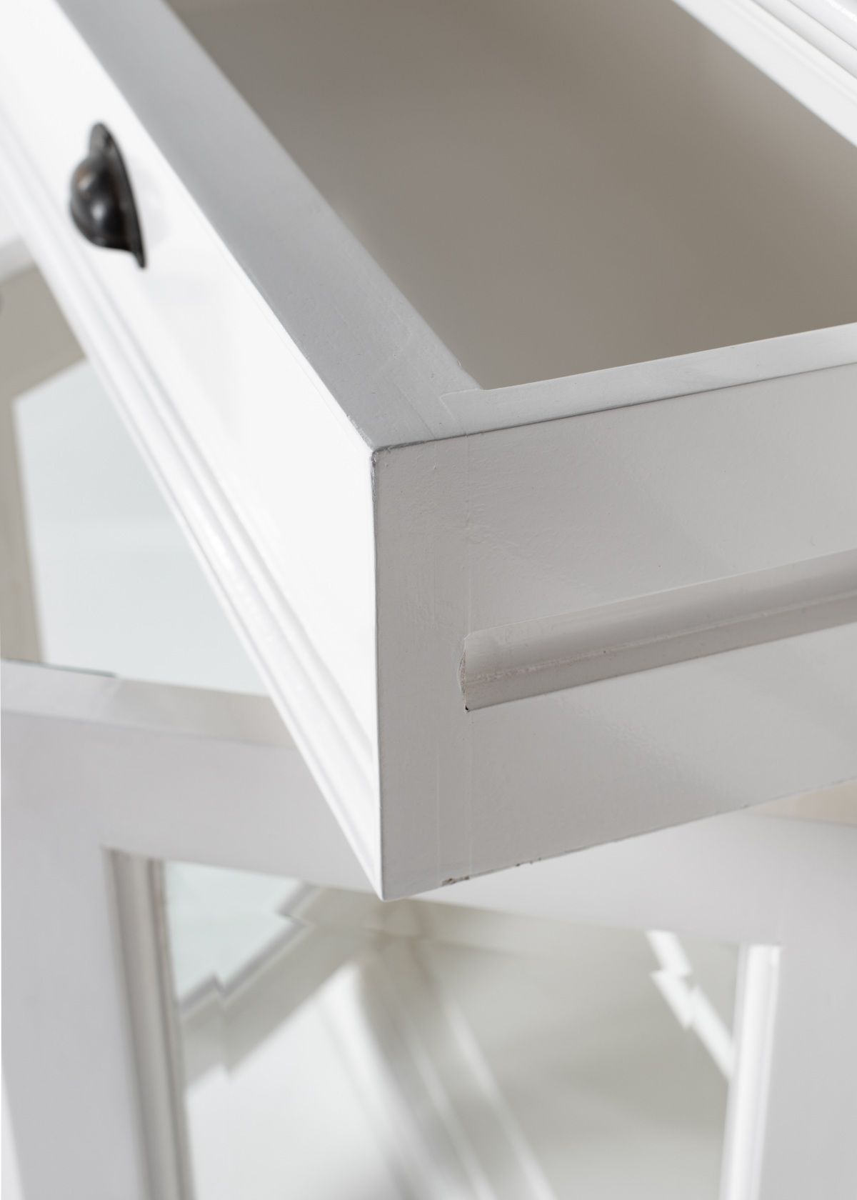 Klassisches weißes Finish – ein vollständig deckendes, halbglänzendes 5-Schicht-Finish, versiegelt mit einem haltbaren Decklack. Die Textur von Classic White definiert sanft das darunter liegende Material, auf natürlichen Holzmaterialien wie Mahagoni und kann zu einem leichten Distressed-Effekt führen.