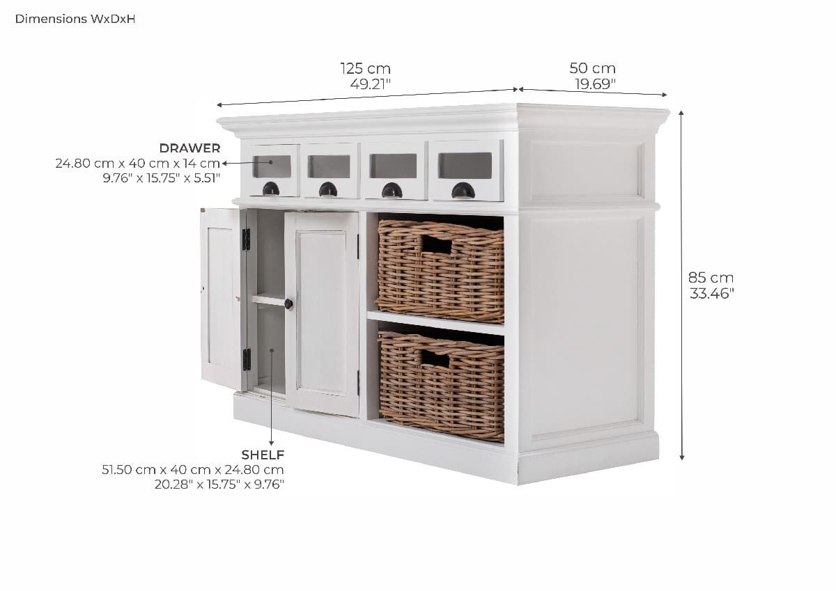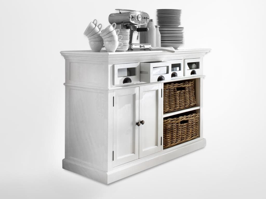 Antik-Lack in Weiß Vintage-Look. Oben 4 verglaste Schubladen, darunter links 2 Türen mit Einlegeboden, rechts 2 Fächer mit Rattan-Körben in Kubu-Grau. Maße: Breite: 125 cm, Tiefe: 50 cm, Höhe: 85 cm. Art. B131HALIFAX Sideboard mit Vitrinenschubladen im Landhausstil - Rahmen aus Plantagen-Mahagoni vollmassiv, Füllungen in MDF lackiert. Die enthaltenen Körbe sind Rattan in Kubu-Grau. Die Schubladen des Halifax Sideboards sind mit patinierten Muschelgriffen und laufen auf Holzauszügen. Halifax Sideboard mit den verglasten Schubladen ist fertig montiert und antikweiss lackiert. Die Kanten und Oberflächen sind in unregelmäßigen Abständen einzeln und von Hand angeschliffen, so dass auch dunkles Holz teilweise durchkommt (siehe Detailbild). Durch diese aufwändige optische Veredelung entsteht das Gefühl des Charmes vergangener Zeiten. Dieses sind ausdrücklich gewollte Effekte, unterstreichen den rustikalen Charakter dieses schönen Landhausstil Sideboard weiss Glasschubladen Halifax.