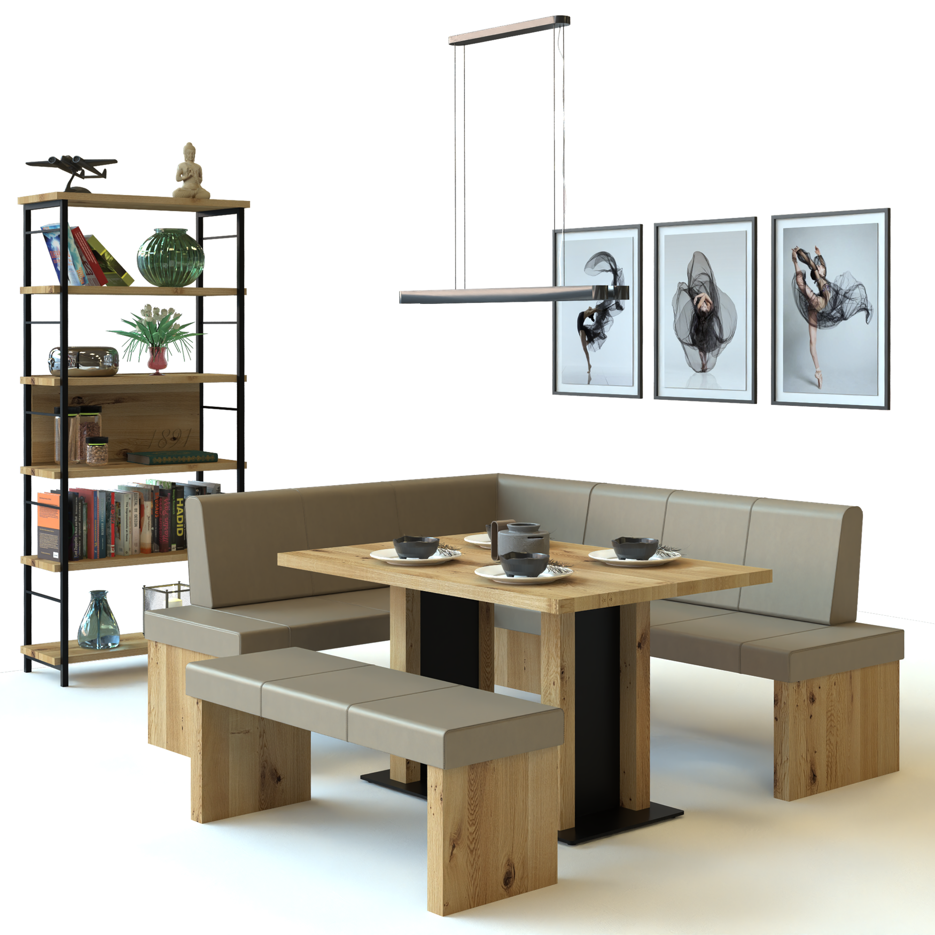 Diese Eiche massiv Eckbankgruppe mit Echt Leder Polsterung ist die perfekte Lösung fürs Esszimmer.