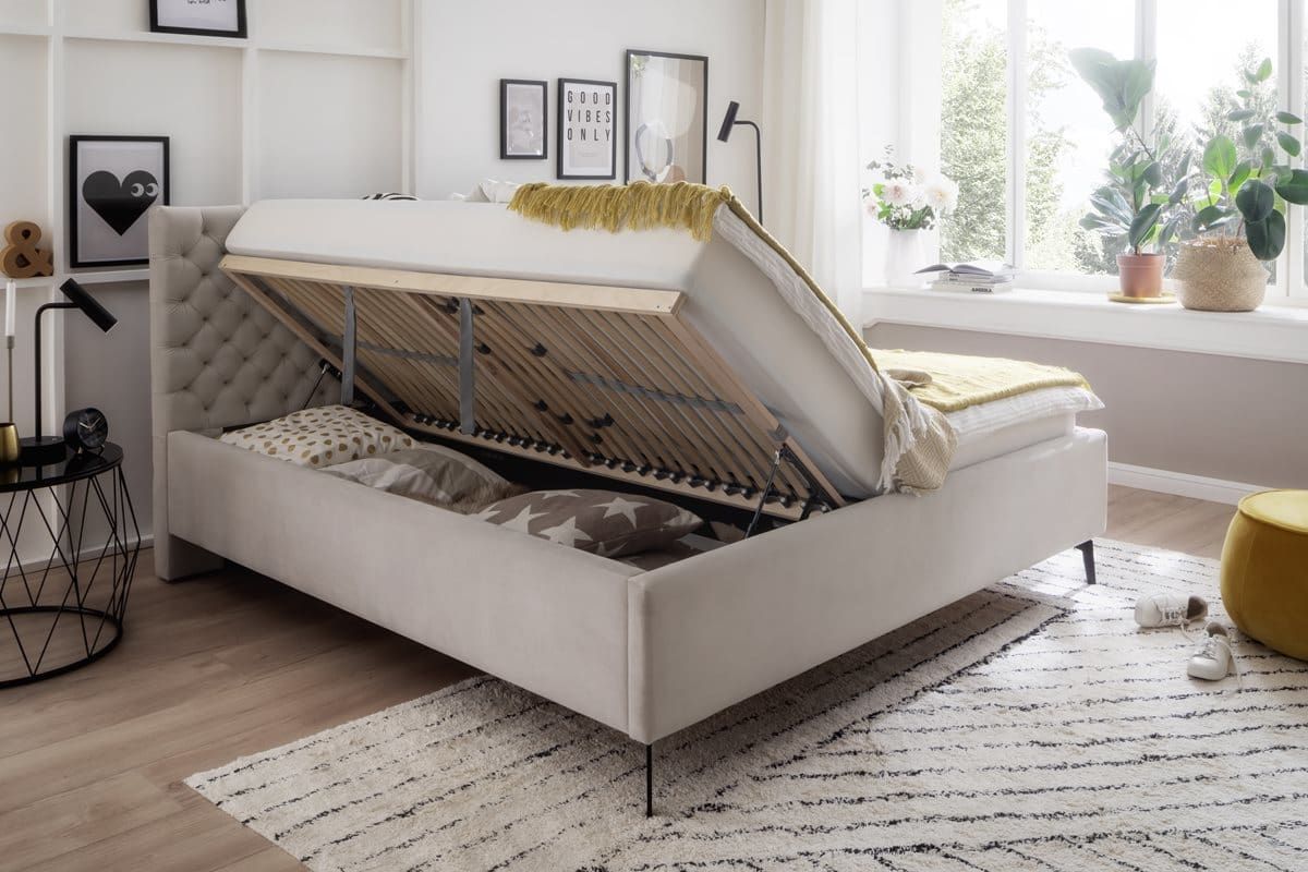 Polsterbett Landhaus Wow. Ein Bett was jedes Schlafzimmer zu einem Lieblingsort verwandelt. Dieses Polsterbett ist mit einem aufwendig verarbeiteten Kopfteil in Chesterfieldsteppung versehen. Das Bett im Landhausstil ist mit einem praktischem Bettkasten ausgestattet. Die Lattenrahmen lassen sich bequem seitlich öffnen und somit entsteht im Handumdrehen noch mehr Stauraum. Das Bett wird ihnen optional mit Matratzen ausgeliefert. Sie liegen dann bequem auf einer Wendematratze mit 7-Zonen Tonnentaschenfederkern.
