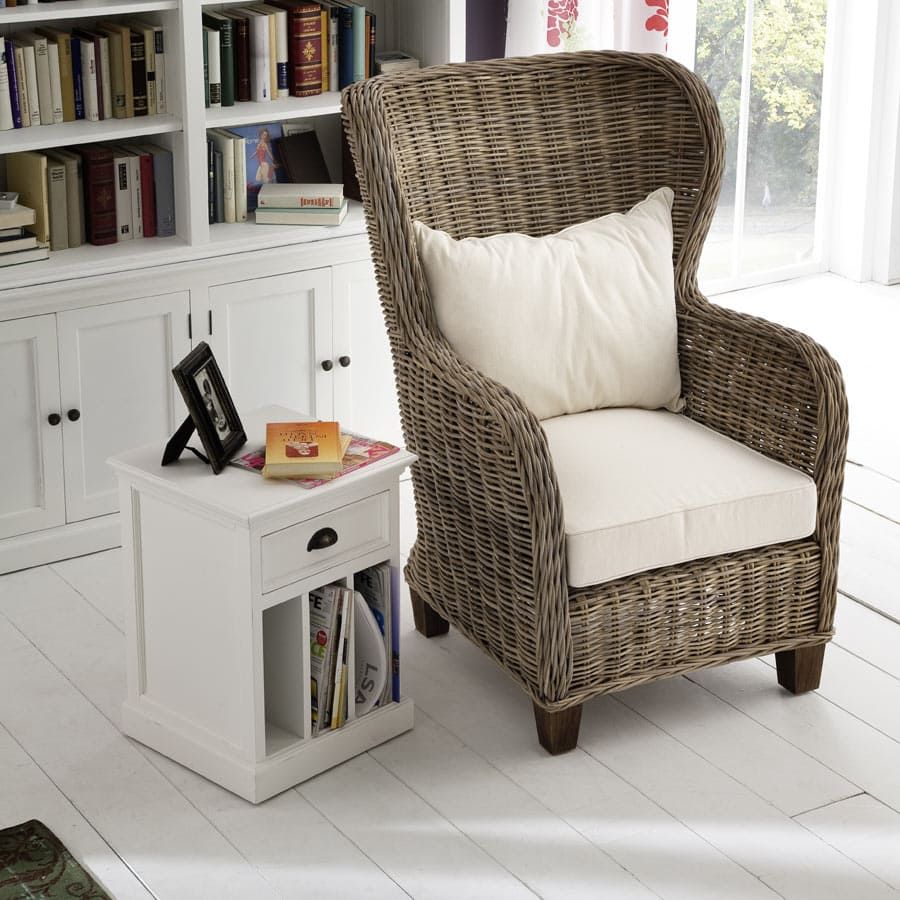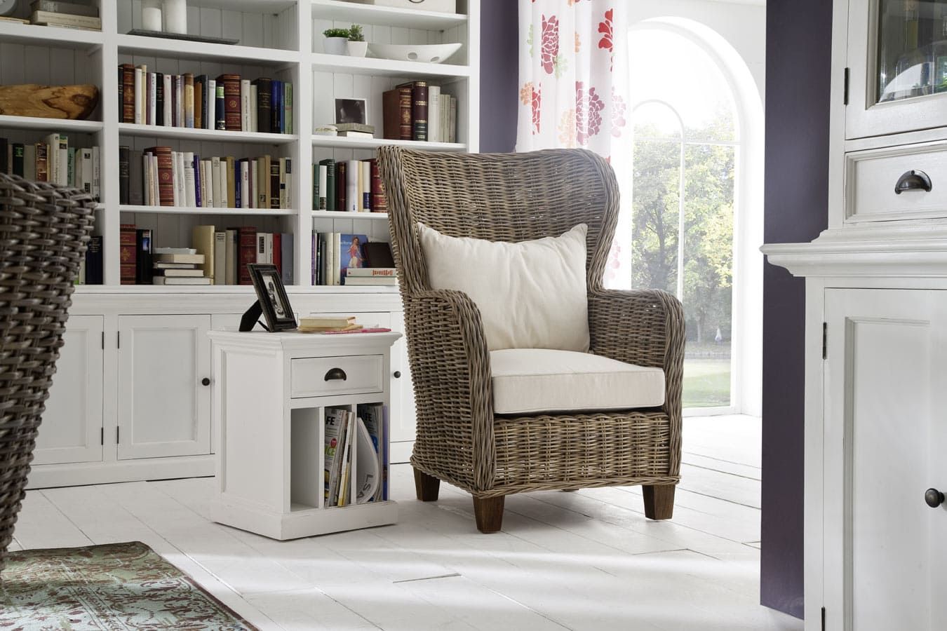 Ein herrlich bequemer wahrhaft königlicher Ohrensessel inkl. Kisssen der zum langen Chillen einlädt und viele entspannte Stunden verspricht! Die Rückenlehne ist rund von Hand geflochten. Da die Farbe des Sessels kubu grau ist, passt der Ohrensessel perfekt zu allen Landhausstil Möbeln des Halifax Programms und anderen weissen Möbeln. Die Harmonie des Sessels zu weissen Landhaus Möbeln ist perfekt. Die passenden zwei Sitzkissen sind im Lieferumfang enthalten. (Bezug Baumwolle natur, durch Reißverschluß abnehmbar). Die Struktur ist ein Fischgrat-Muster, im Detailbild gut erkennbar. Das schön dicke, runde Geflecht des Halifax Ohrensessel bildet einen ausgezeichneten Kontrast zu den feinen Oberflächen der HALIFAX Landhausstil Möbel.
