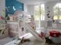 Spiel und Spaß im Kinderzimmer - das komplette Rutschbett BLÜMCHEN von Infanskids. Toben, Spielen, Rutschen - das TÜV GS geprüfte Rutschbett von Infanskids macht alles mit. Die romantischen Blümchendekore der mitgelieferten Zubehöre und die weisse Lackierung des Kiefergestells, machen ein Landhausstil Hochbett aus dem Kinderhochbett. Mit schräger Leiter und Griffloch, Rutsche, Tunnel, Stoffen und und und....