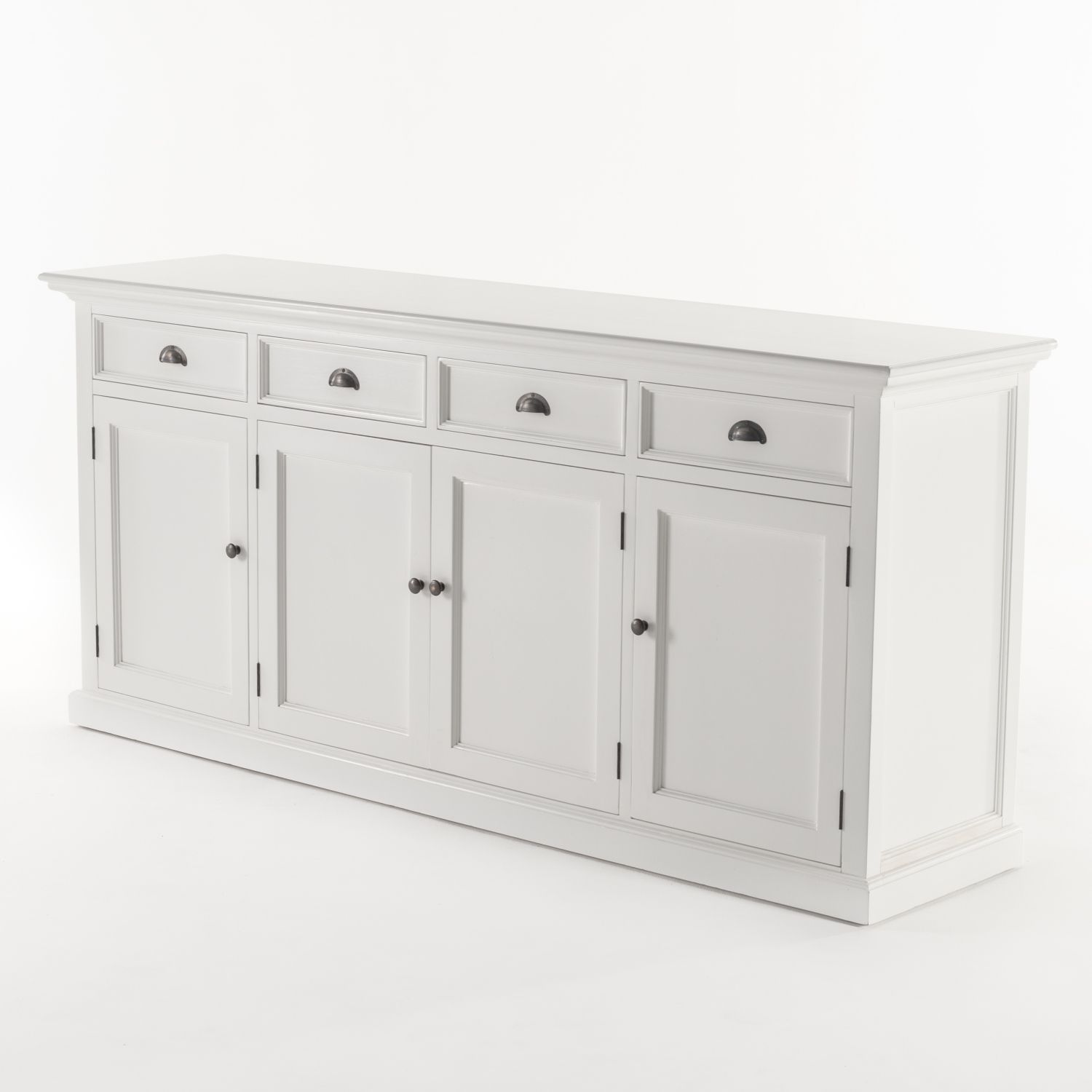 Sideboard weiß mit 4 Türen und 4 Schubladen im Landhausstil Halifax. Das Sideboard Halifax in weiss ist völlig zeitlos und 200 cm breit. Das weiße Landhaus Sideboard zeichnet sich durch seine unglaubliche Vielseitigkeit aus. Nach der Fertigstellung wurde dieses 200 cm breite Sideboard weiß lackiert. Aufgrund seiner schlichten Optik ist dieses Landhaus Möbel ideal zum Einsatz als Solitätmöbel oder zur Ergänzung anderer Möbel. Denn es fügt sich bedenkenlos in vorhandene Wohnwelten ein. Mit vier Schubkästen und vier Türen ausgestattet liefern wir dieses Sideboard fertig montiert per Möbelspedition bis in Ihre Wohnräume.