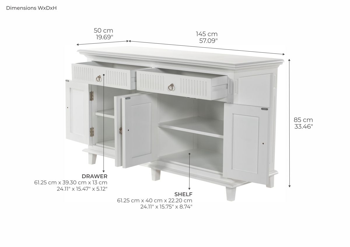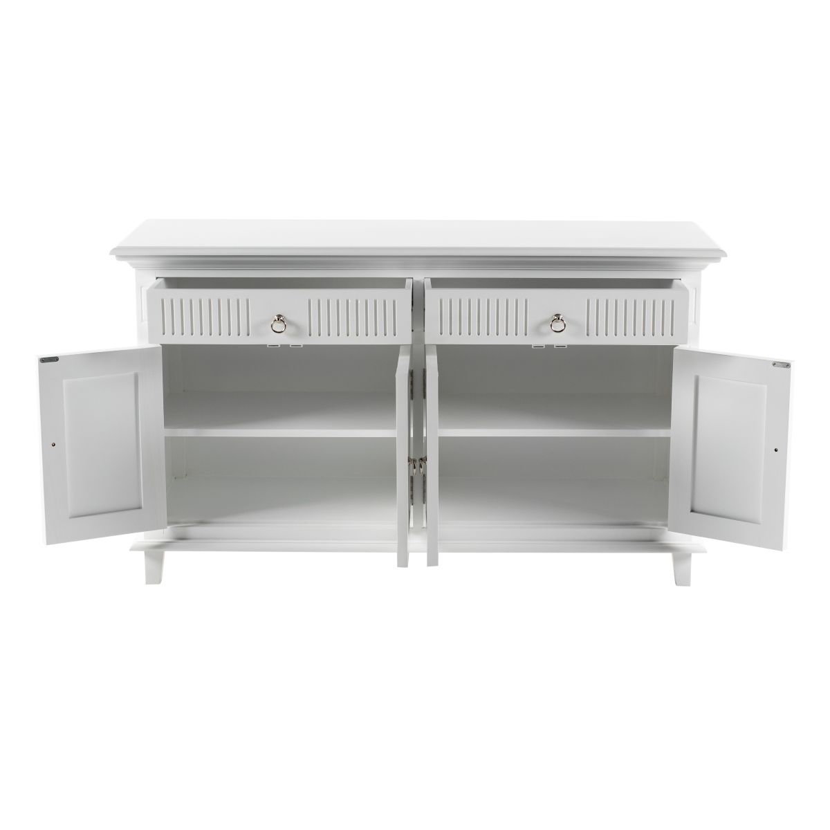 Dieses Sideboard ist mit 4 Türen und 2 Schubladen ausgestattet und hat je einen Einlegeboden aus Holz hinter den Türen.