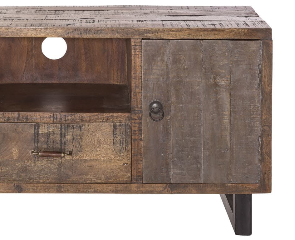 TV-Board Priya mit 1 Gerätefach, 2 Türen und 1 Schublade mit unterschiedlichen Griffen, B/H/T: ca. 120 x 60 x 40 cm auf Metallkufen, vintage behandelt, Top & Seiten 3 cm stark. Das eine Fach beim Lowboard hat die Maße: Breite: 44 cm, Tiefe: 34 cm, Höhe: 21 cm