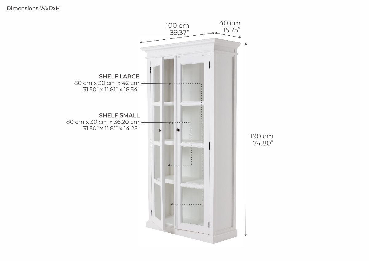 Landhaus Vitrinenschrank, Antik-Lack in Weiß. Mit 2 Glastüren, dahinter 4 Fächer, fertig montiert. Sehr solide gearbeitet. Maße: Breite: 90 cm, Tiefe: 35 cm, Höhe: 190 cm. Art. CA595HALIFAX Landhausstil Vitrine - Rahmen aus Plantagen-Mahagoni vollmassiv, Füllungen in MDF lackiert. Schubladen sofern vorhanden auf Holzauszügen. Schöne patinierte Muschelgriffe aus Metall. Diese Vitrine Landhausstil weiß antik Halifax 2 Glastüren wird fertig montiert geliefert und ist antikweiss lackiert.