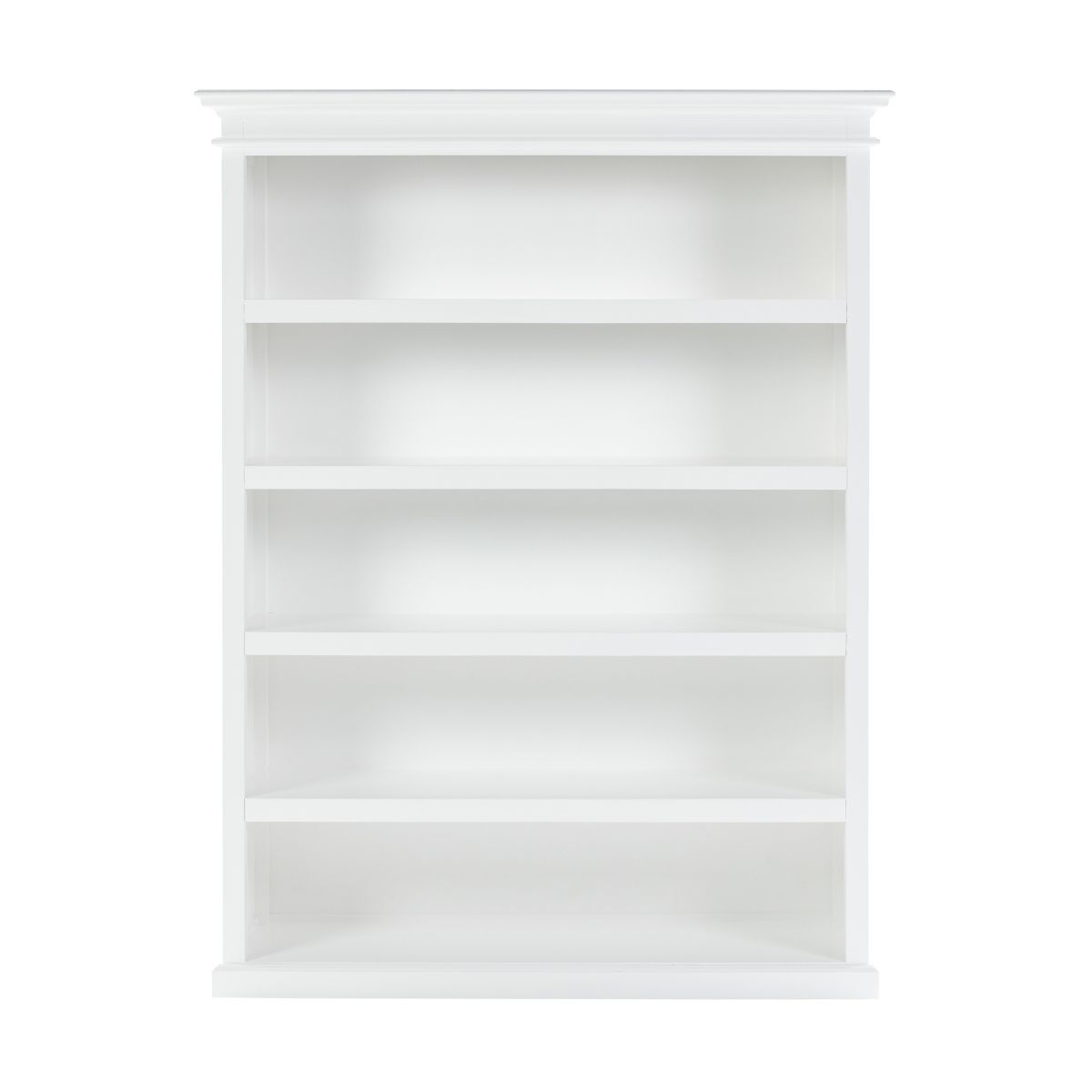 Das breiteste Halifax Bücherregal in weiss ist völlig zeitlos und 150 cm breit. Mit 5 offenenen Fächern bietet dieses Regal fantastisch viel Platz für all Ihre Bücher. Das weiße Landhaus Bücherregal zeichnet sich durch seine immense Vielseitigkeit aus. Die weiße Lackierung wurde auf das fertig montierte Regal aufgebracht. Aufgrund seiner schlichten Optik ist dieses Landhaus Möbel ideal zum Einsatz als Solitärmöbel oder zur Ergänzung anderer Möbel. Denn es fügt sich bedenkenlos in vorhandene Wohnwelten ein. Mit vier festen Regalböden ausgestattet liefern wir dieses Stück fertig montiert per Möbelspedition bis in Ihre Wohnräume.
