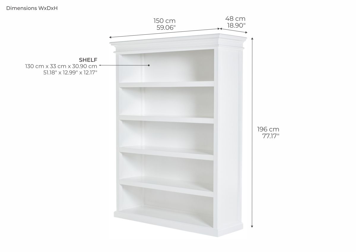 Das breiteste Halifax Bücherregal bietet Ihnen den meisten Platz für Ihre schönen Bücher. Aber auch im Kinderzimmer oder Esszimmer findet sich immer ein Platz für dieses schöne weiße Möbelstück. Rahmen Mahagoni vollmassiv, Lack in weiß seidenmatt. Maße: Breite: 150 cm, Tiefe: 48 cm, Höhe: 196 cm. Die Fachtiefe beträgt 33 cm, genug Platz in der Tiefe auch für größere Bücher oder Aktenordner. Die weiteren Maße finden Sie in den Bildern dargestellt Die Füllungen sind aus lackiertem MDF. Belastbar ist dieses Regal mit insgesamt max 100 Kilogramm