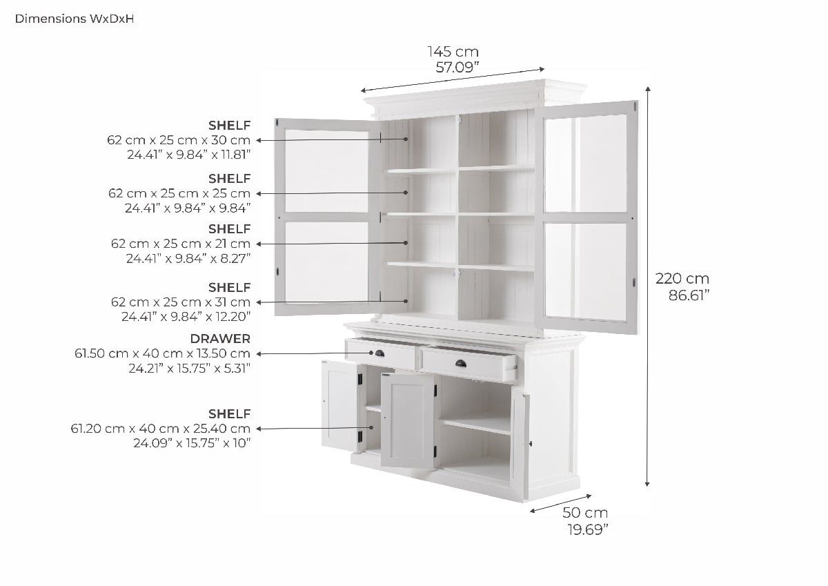 Buffet HALIFAX im Landhausstil - Rahmen aus Plantagen-Mahagoni Massivholz, Füllungen in MDF lackiert. Die Möbel Schubladen sind auf Holzauszügen. Schöne patinierte Muschelgriffe aus Metall. Das Buffet Landhaus weiss Halifax Küchenbuffet von Novasolo ist fertig montiert. Die Möbel sind antikweiss lackiert.